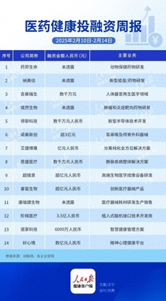 (人民日报健康客户端记者 王宁)据人民日报健康客户端不完全统计,本周(2月10日-14日)全国医药健康领域共有14家企业获得融资,涉及植入式脑机接口、疫苗研发、耳鼻喉等领域。其中,6家企业融资超亿元。